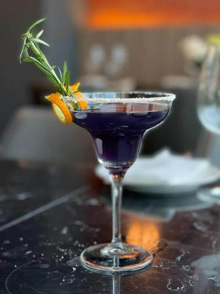 Betcha you’ve not tried tequila with coconut, but the combination makes perfect sense in a twist on the party-ready margarita. This feminine version with its cool purple hues gets its colour from blue curacao, lime juice and grenadine, with silkiness from coconut water and punchiness from tequila. It’s a fresh, fun palate cleanser to the farm-to-table grill cuisine such as pan-seared fjord trout, French corn-fed chicken breast with barley risotto and grass-fed beef tenderloin in black pepper sauce.