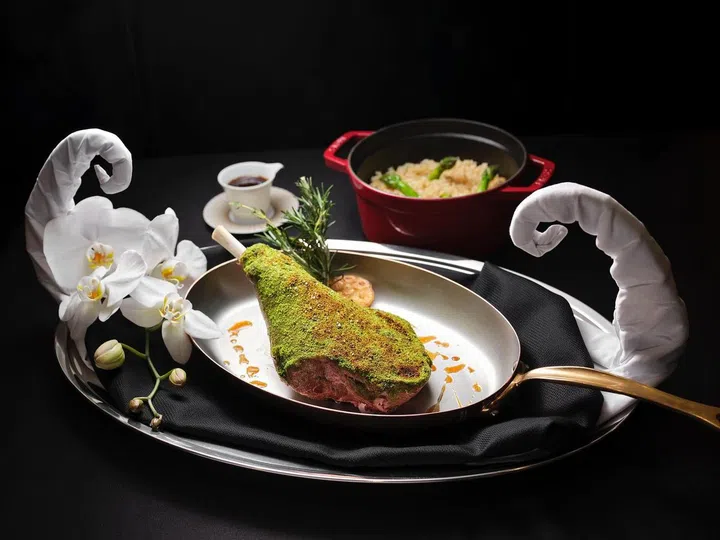 The curated set features milk-fed lamb legs from Pyrenees, pan-seared then slow-roasted to juicy perfection. Al dente and fragrant pilaf rice accompanies the meat, as well as a basket of mini croissants and baguettes, all freshly made to ensure maximum crustiness and fluffiness.