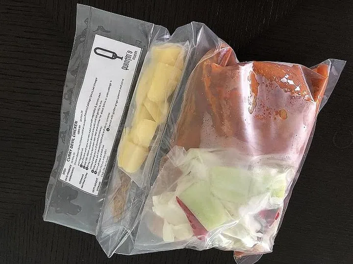 ix your chicken curry craving with this DIY kit from Quentin’s ($20.80). Each sealed bag comprises of chicken pieces, cocktail sausages and bacon bones marinated in curry spice mix; a bag of potatoes; a bag of cabbage, cucumber and chilli padi; and a small bag of fried ginger julienne.