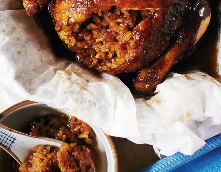 4 Stuff the glutinous rice mixture into the spring chicken and secure the underside with toothpicks.