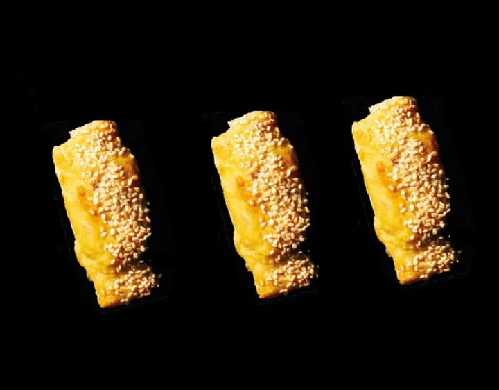3 Preheat oven to 260 deg C. Roll dough into a flat sheet and cut it into a 10cm by 5cm sheet. Place 2 tbsp of the barbecued pork filling on the dough and fold it into half. Place on an oil-greased tray and brush a layer of egg yolk on the pastry. Repeat for the rest of the dough and filling. Garnish with sesame seeds.
