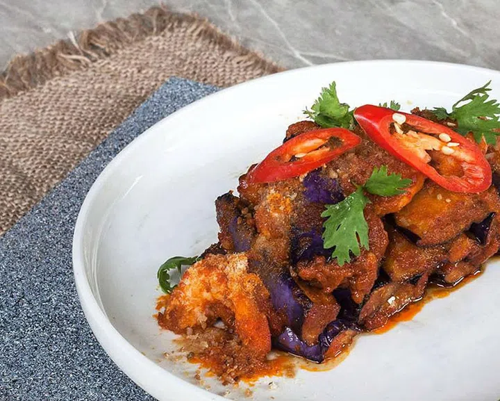Similar to Peranakan cooking, sambal titek is used to make the base of this dish. Titek (usually referred to as rempah titek) comprises of fragrant spices like red chillies, shallots, belacan and candlenuts. Adding sugar, lime juice and salt thins out the rempah and adds another layer of flavour - and that’s just the base. This is then used to fry up the prawns with a little bit of garlic. A mix of chicken, fish and prawn stock is added to the dish and brought to a boil. That’s when the fried brinjal and dried shrimps are dropped in.