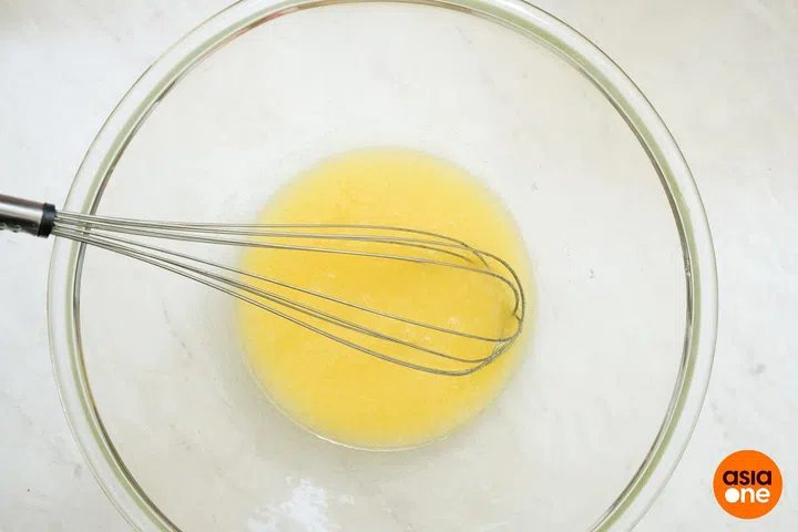 2. Add egg, caster sugar, vanilla extract and vegetable oil into a bowl and mix well till you get a smooth pale yellow mixture.