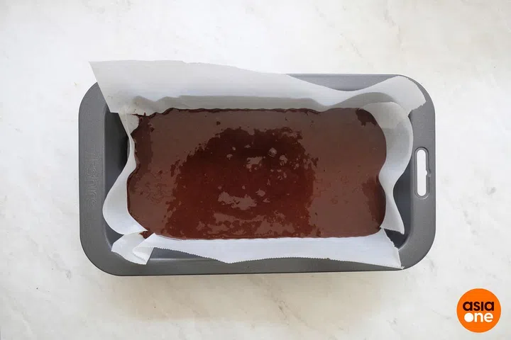 5. Pour batter into a loaf tin lined with baking paper. Tap the pan on the table to remove any air pockets in the mixture. Place into an oven that has been pre-heated to 175 degree Celcius and bake for 50 to 55 mins.