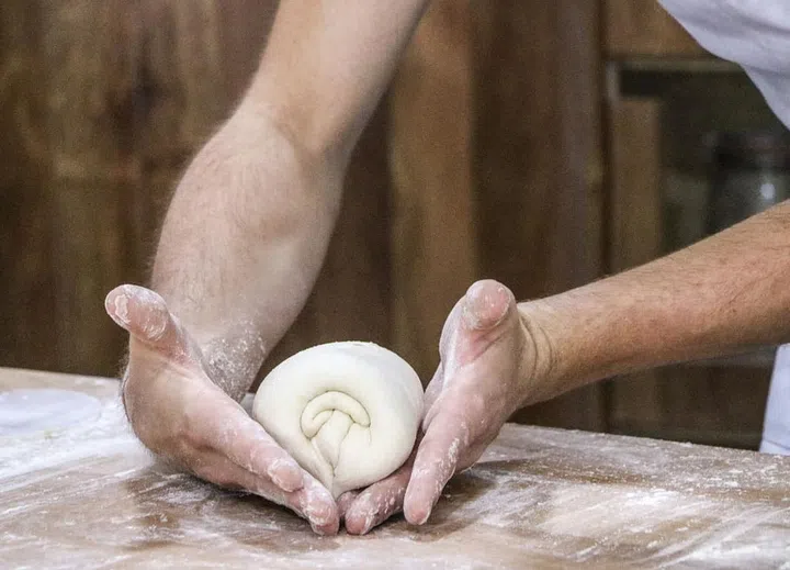Remove the dough from the bowl and place it on a lightly floured surface. After doing so, wet your hands with some water as this keeps the dough from sticking.