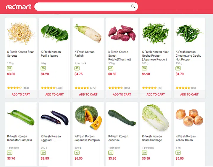 Want to buy K-fresh goods online? Go to RedMart and select the brand “K-fresh”, which will show you all the seasonal fruits and vegetables available now, all at fairly reasonable prices. RedMart also imports a variety of popular traditional Korean frozen foods, such as soy marinated Suhyup Korean Crab ($35.40) and Arumi Korean Japchae ($4.80).