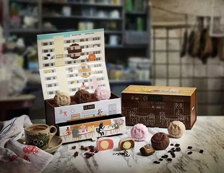 That’s not all. The mooncakes come in a box with nostalgic illustrations of an HDB block and a kopitiam, along with a quirky and functional kopi dabao bag.