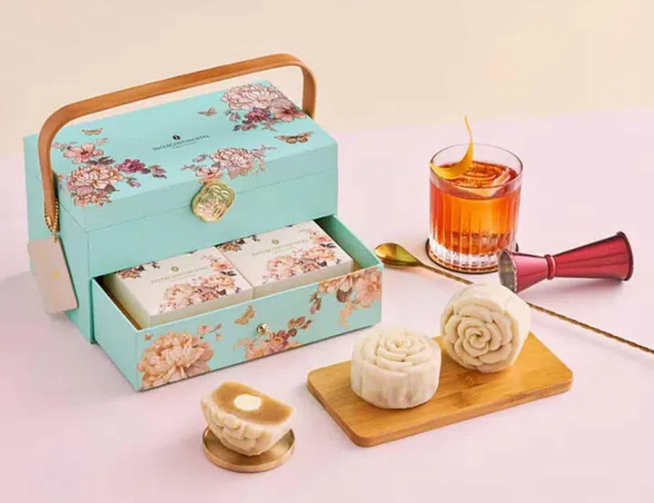 Savour the bold deep flavours of your favourite Negroni in the limited edition InterContinental Negroni Truffle snow skin mooncakes ($126 for a box of four). Housed in an elegant floral and butterfly printed box, the new creation has a delicate snow skin with a floral motif enveloping white lotus paste and a negroni truffle centre.