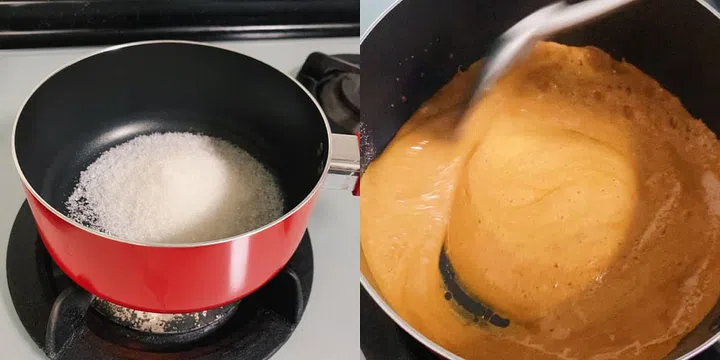 To begin, add 150g of sugar to a pan over low heat — adjusting it accordingly so you don’t burn it.