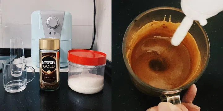 Now if you're not already a pro at making this easy iced beverage, then fret not. To make this drink, all you need is 2 tablespoons of ground coffee, 2 tablespoons of white sugar, and 2 tablespoons of hot water. Combine these ingredients into a bowl (if you're using a large whisk) or in this case, a cup — of which I used a small whisk to create the soft, foamy whipped coffee. I recommend getting the small whisk from shops like Daiso (where I got mine) as it's not only affordable but it's also really convenient and easy to use.