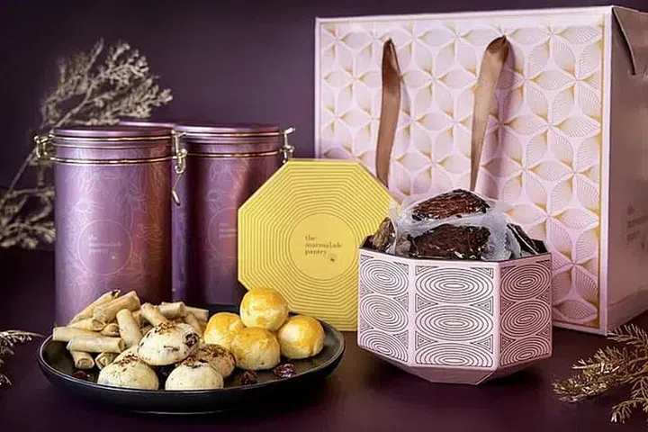 Homegrown bakery PrimaDeli has a new line-up of seven Prosperity Cookies this year, with flavours that include the Cocoa & Cashew Nuts cookies, Speculoos cookies, and Chocolate Chip Mylos cookies, each costing $21.30 per tin. This is in addition to its Supreme Pineapple Tarts ($27.80) – made with freshly-grated pineapples and premium European butter – and its stalwart bakes like the Premium Pandan Chiffon ($9.90/$18.90), and Kueh Lapis ($55.80).