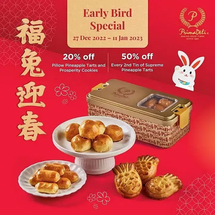 Available at Prima Deli stores. Visit its website for more information. There is an early bird discount till Jan 11, 2023, where you get 20 percent off Pillow Pineapple Tarts and Prosperity Cookies and 50 percent off every second tin of Supreme Pineapple Tarts. From Jan 12 to 31, 2023, there is 10 per cent off Supreme/Pillow Pineapple Tarts and Prosperity Cookies.