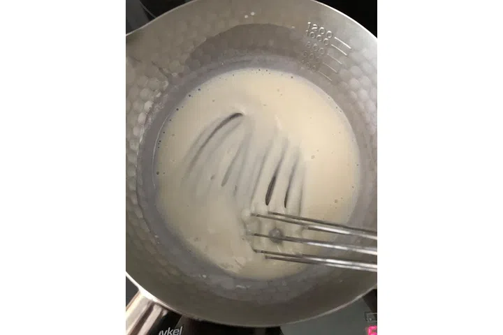 1. Make the tangzhong: Weigh out the ingredients in a small saucepan, starting with flour and ending with milk. Whisk thoroughly to remove lumps.