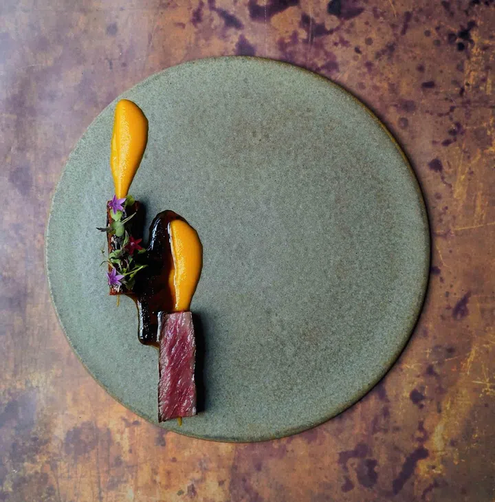 For the main course, dry aged, grass-fed A4 Kagoshima wagyu is grilled over coconut husk charcoal and binchotan. The carrots that complement the dish are confited in excess beef fat, then slow-cooked, dried and rehydrated with beef sauce. The carrot trimmings are used to make an accompanying smoked carrot ketchup.