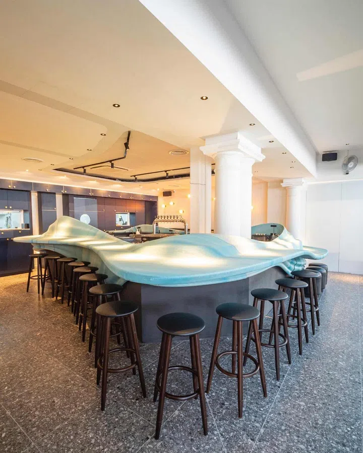 Housed in Chijmes, Analogue’s indoor and alfresco dining space boast eco-friendly fixtures that marks its sustainability ethos. The centrepiece is a 20-metre, 3D-printed bar top reminiscent of blue waves and made from 1,600kg of recycled plastic bottles. The smaller tables on the side are crafted from mycelium, a type of fungus.
