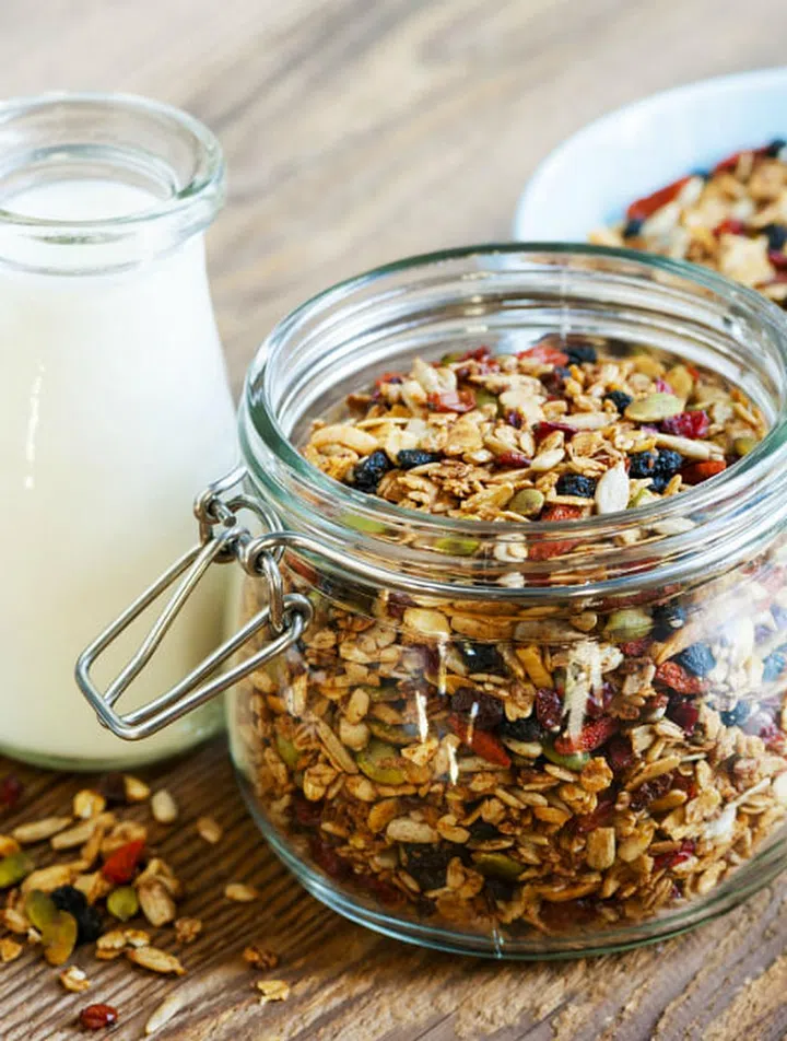 Once it’s done, transfer your granola into a container and all that’s left to do is grab your desired amount the next morning, mix it in with some creamy yoghurt and enjoy your on-the-go breakfast.
