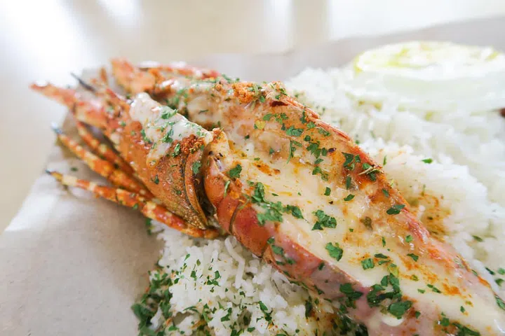 We went at 10am, two hours after opening, and the queue was going strong – with about 30 people in line. Inside a cramped kitchen was a flurry of people, deep frying chicken, spooning sambal next to fragrant heaps of coconut rice, and piping cheese onto rows of vivid red lobsters.