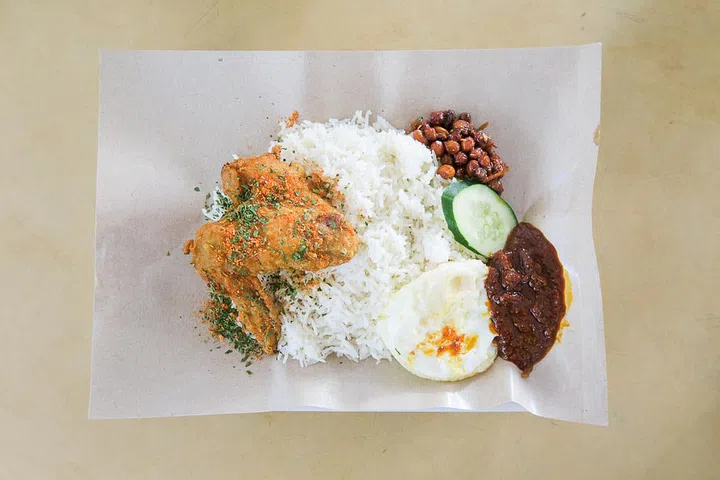 The chicken skin is crunchy and fragrant, and the meat juicy and sinfully oily, like good old school nasi lemak you’d buy from a school canteen as a child.