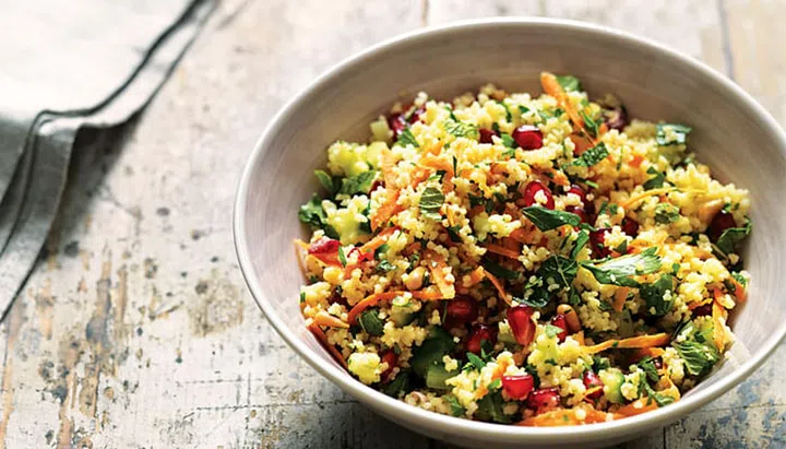 The pomegranate seeds look like little red rubies in this couscous salad. Enjoy it as a starter or on its own for fewer calories.