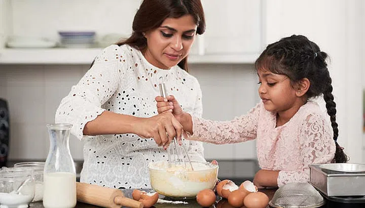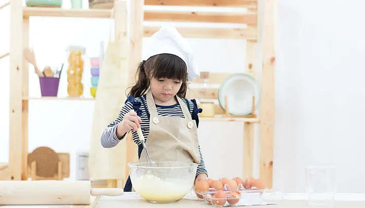 Your kid might drop flour on the floor or smash the egg flat. It’s irritating… but try to let go of perfection and focus on the great life skills you’re passing on, like counting and nutrition. Even if things don’t go perfectly, do compliment your junior chefs on how well they have done. Then let them try again another day. Little by little, your child will gain valuable life skills and more confidence and resilience. That’s a recipe for success, right?