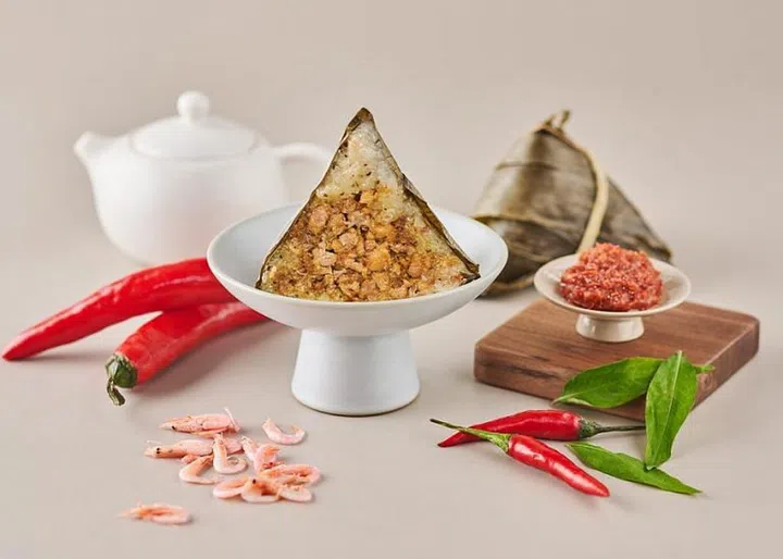 The hae bee hiam dumpling is exclusively available as part of a Golden Treasures Hamper ($138 nett), which includes six dumplings in three flavours. The other two flavours include a Gourmet Bak Kwa with Yolk Rice Dumpling, as well as a Blue Pea Nyonya Rice Dumpling.