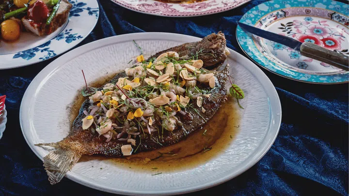 Other highlights include the Dry Aged Spiced Roasted Chicken, a slow-roasted spring chicken served with parsnip puree and chilli jam, or the Lemon Sole Meuniere, a French classic with an Asian twist, featuring a whole sole fish in an "Asian grenobloise" sauce topped with coldwater shrimp and sliced almonds.