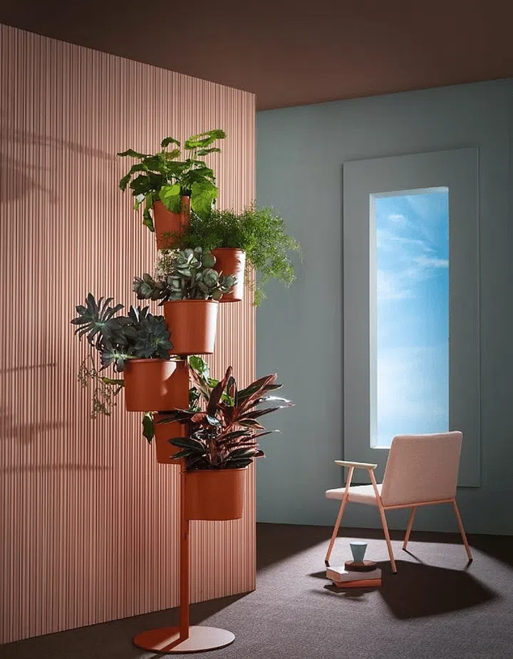 The Hevea indoor potholder has easily removable polypropylene pot modules that are easy to attach — either opposite one another or in a spiral for two different looks. A longer version doubles as a screen.