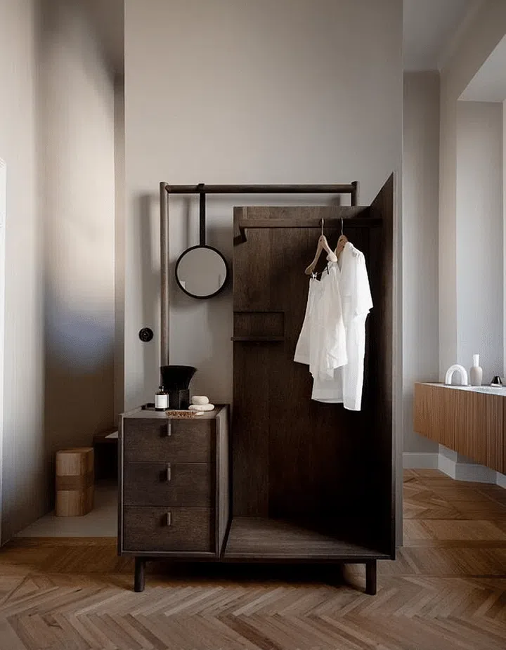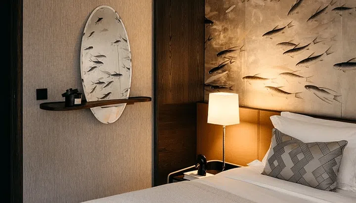 Uniquely designed mirrors can also take the place of hung paintings. In her design of the Meyerhouse show suite, Tan selected the Bienvenue Mirror from Ligne Roset, whose fluid shape and integrated timber element make it a highlight on a wall.