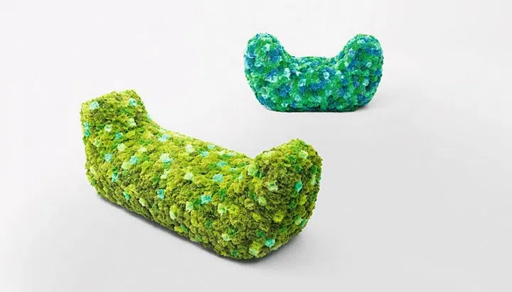 Brazilian designers Fernando and Humberto Campana, renowned for creating iconic pieces with waste materials, were invited to create a collection of five pieces. One of them is the floral-like Bruco indoor seat, whose upholstery is made from polyester fibres derived from the recycling of PET bottles.
