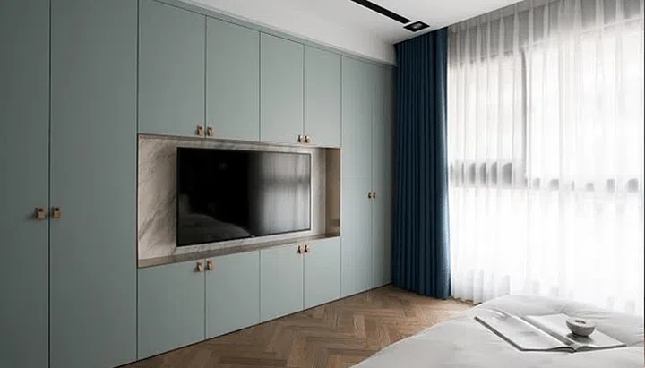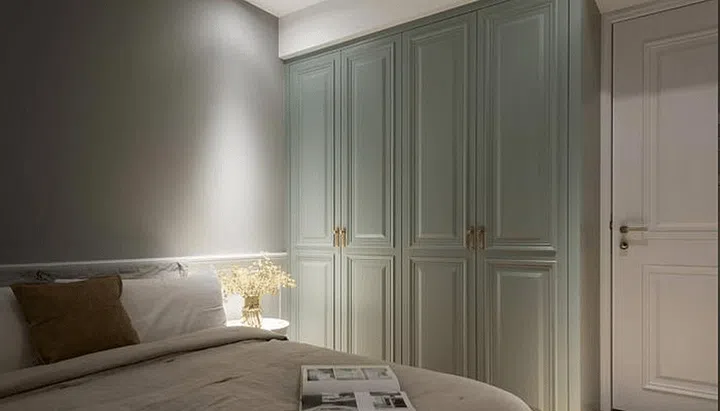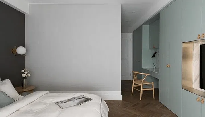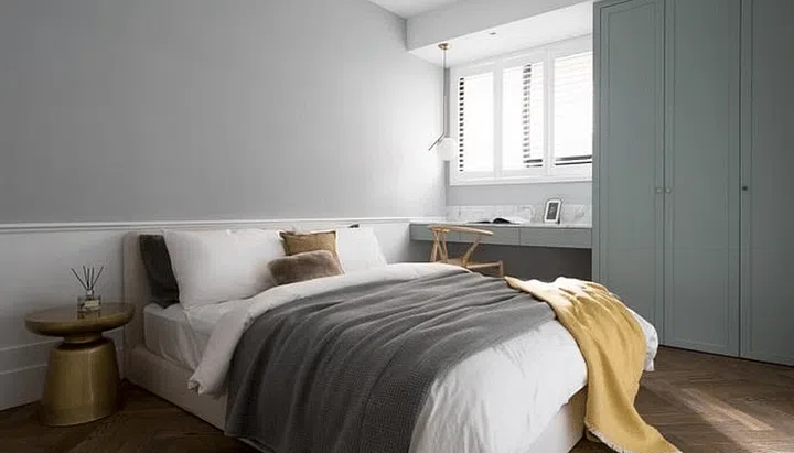 In the bedroom, the colours are kept soft, with details added in the cabinetry and the walls to create depth and character.