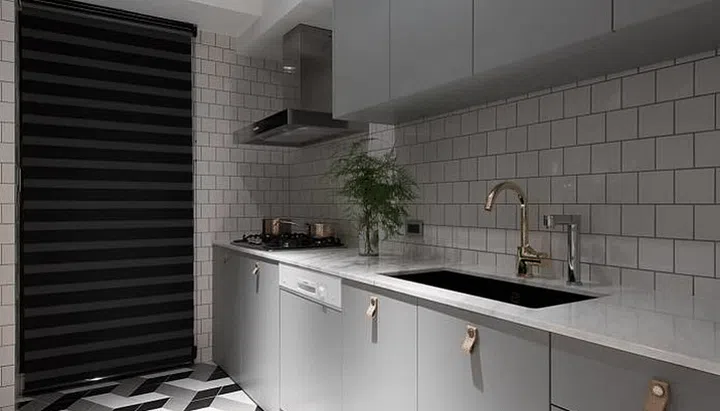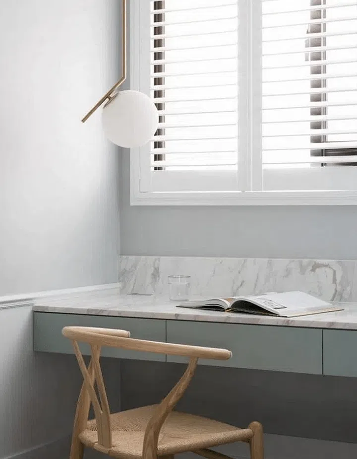 The wall is partially covered in white marble, reflecting the same look used in the counter nearby.