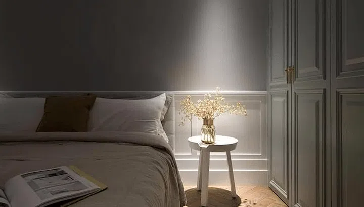 A downlight creates drama in one corner of the bedroom next to the wardrobe.