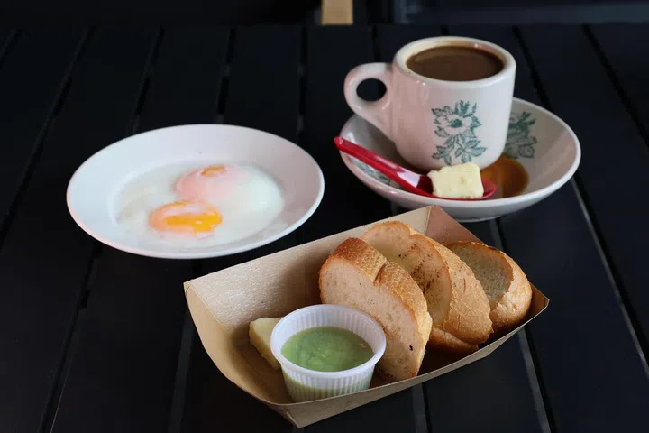 As demand grew for small bites to accompany the drinks, the couple introduced a Kaya Set ($8.50), which includes four pieces of baguette, a small tub of homemade kaya, two soft-boiled eggs and a hot drink. They make the kaya from scratch using home-grown pandan leaves and each batch takes three hours to prepare.