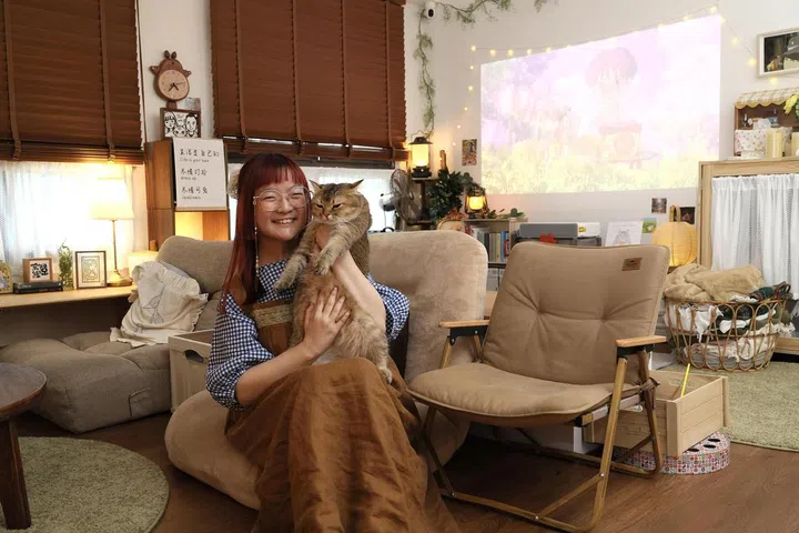 Her home is styled like a small cottage. Studio Ghibli soundtracks play softly to a stream of countryside scenes beamed from a projector. A British shorthair cat named Totoro takes languid naps on the couch.