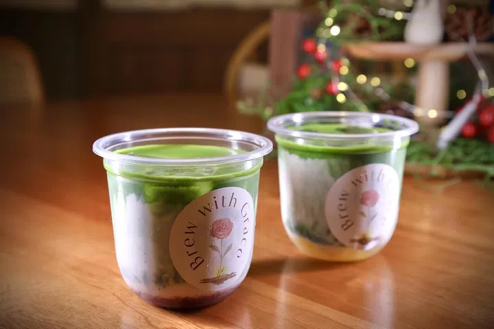 (From left) Strawberry Matcha Oat and Yuzu Matcha Oat at home cafe Brew With Grace.