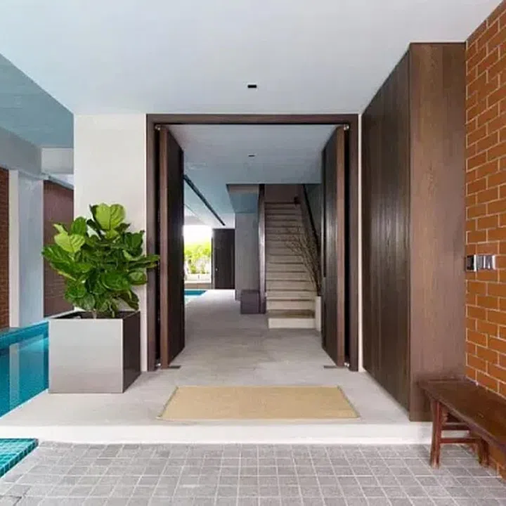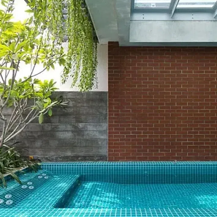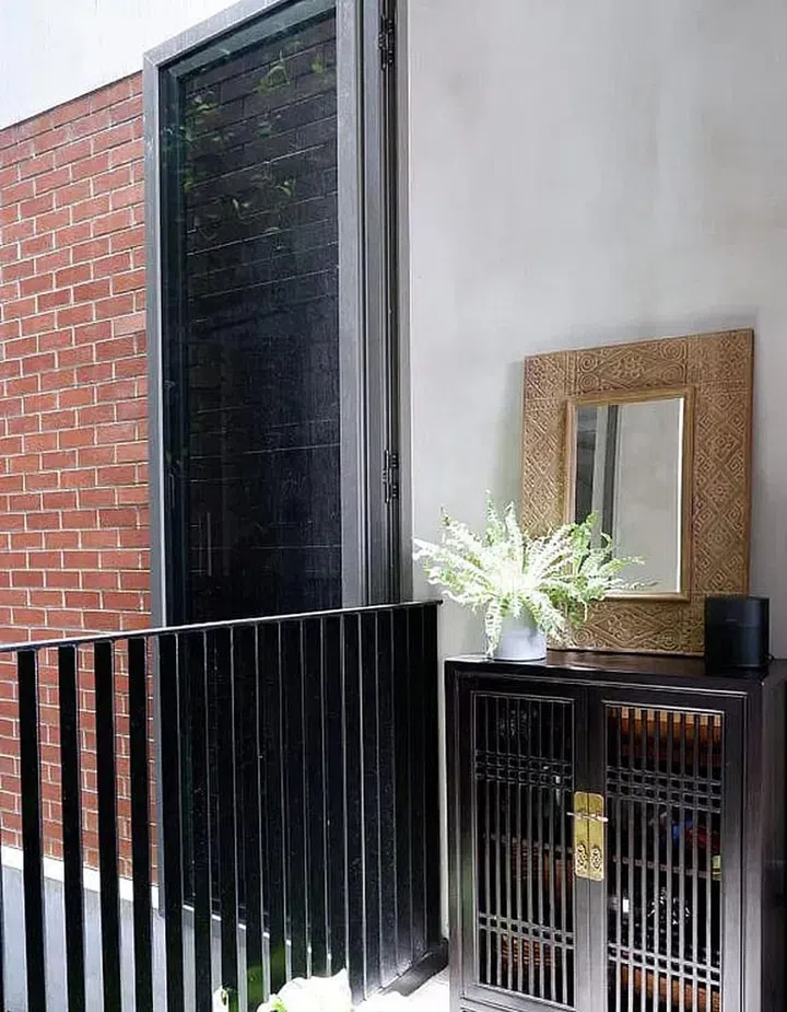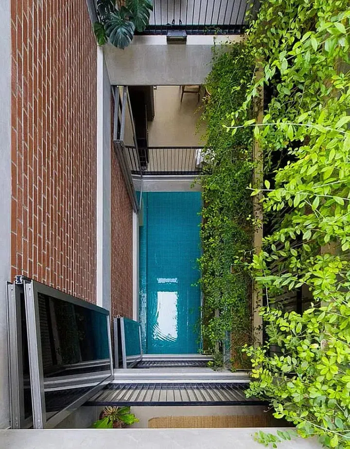 Although flanked by houses on both sides, the home is bright and well-ventilated, thanks to the four-storey air well that rises above the pool.