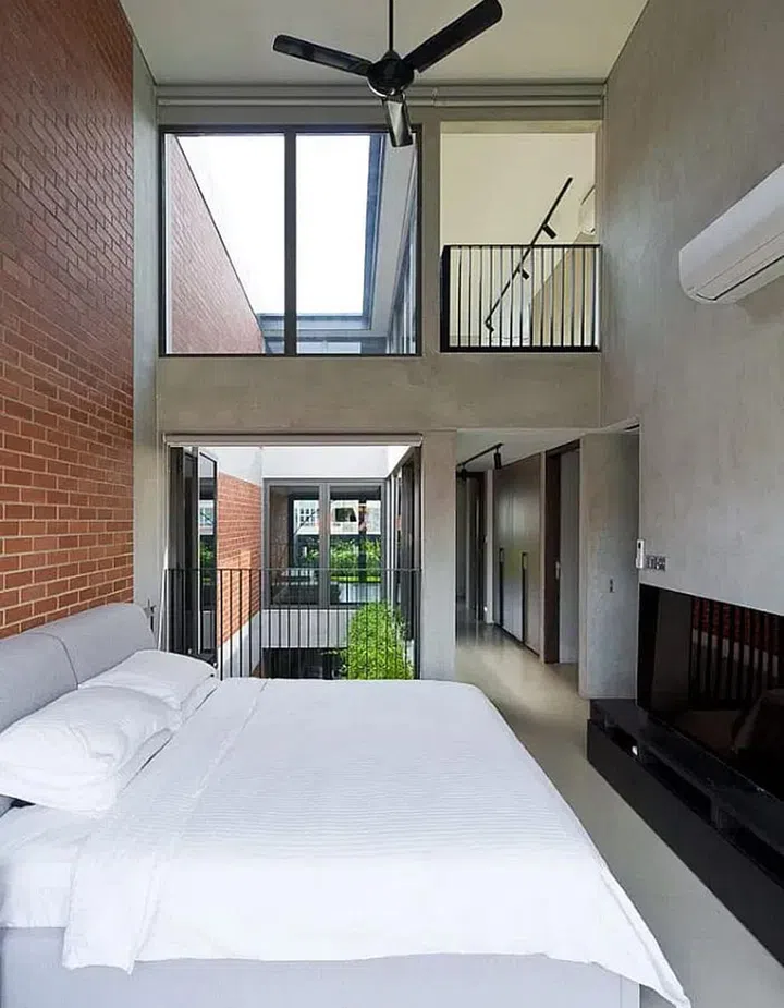 The air well is the focal point in that all the rooms face it. Each has slide-and-fold window walls so it gets adequate cross-ventilation and maintains a connection to the rest of the place.