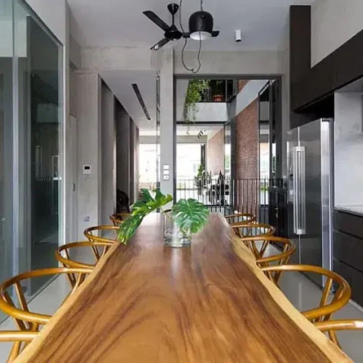This multi-generational family home boasts a four-storey air well and a dining room with a three-metre table