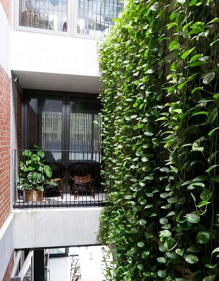 The air well also blurs the boundaries between the outdoors and indoors. Lush plants line its perimeter at each level, giving the appearance of a verdant green curtain.