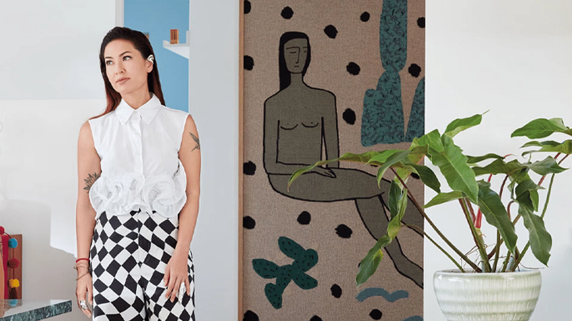 Tracy Phillips dressed in her own Rochas top, Maison Margiela trousers, Toga Pulla boots, Avec earrings, and Fangophilia rings. She loves the desert and wanted to incorporate the tones into her home. Behind her hangs tapestry art from LA-based artist Lilian Martinez. Photo: Gan