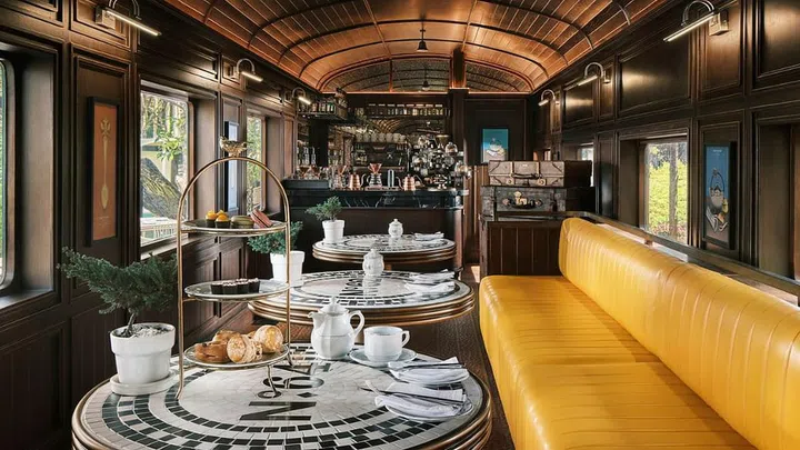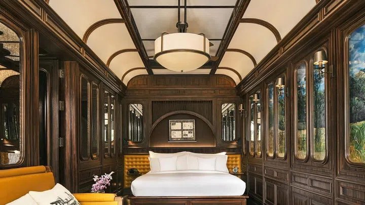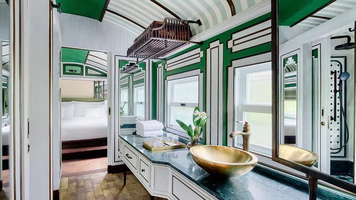 But fret not if you’re unable to check into one of the upcycled carriages, as the other rooms and suites are just as spectacular. Every room is designed to look like a classic railcar and features dramatic panelling and scenic wallpaper.