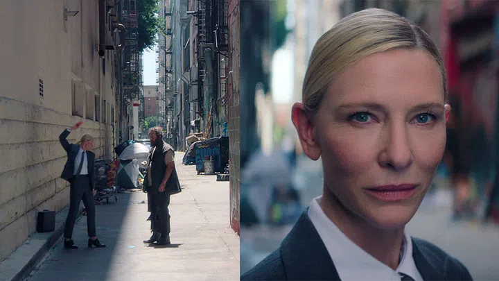 Across the street, a suited recruiter is playing a familiar game of ddakji with an unsuspecting American man. But here’s the kicker, it’s Cate Blanchett in the recruiter role. Yes, not Gong Yoo, but THE Cate Blanchett.