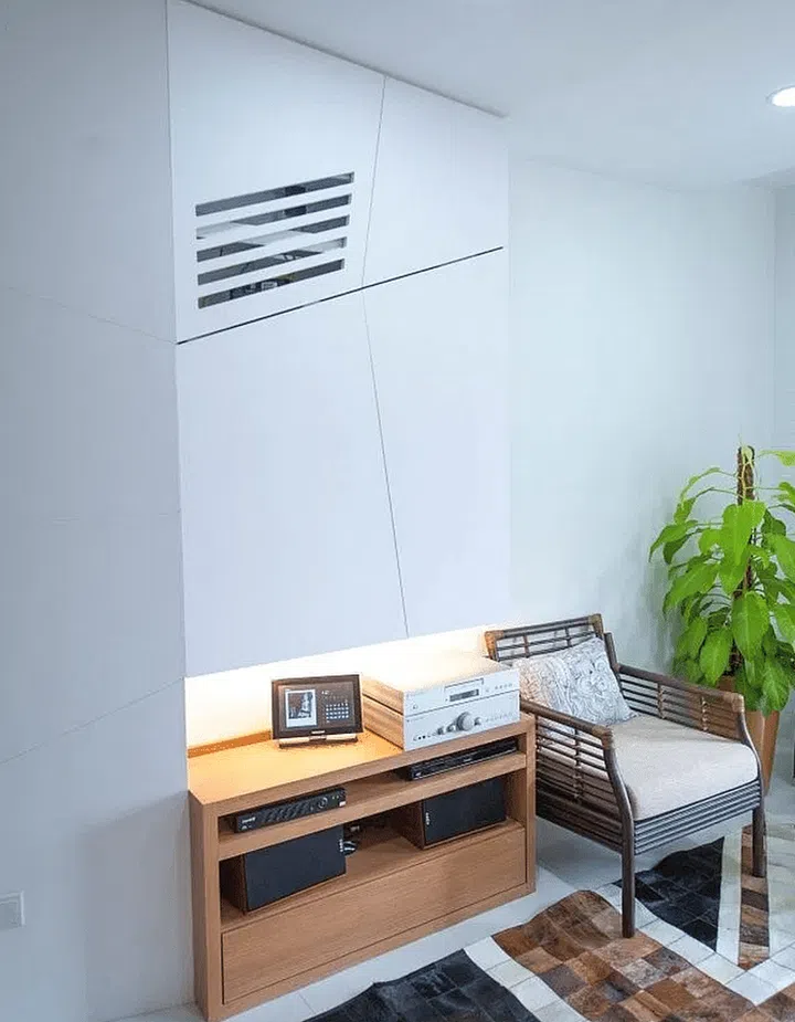 To create dimension in the home, Lester designed an angled laminate wall for the TV cabinetry, and a slanted false ceiling, to give the living room a unique feature.