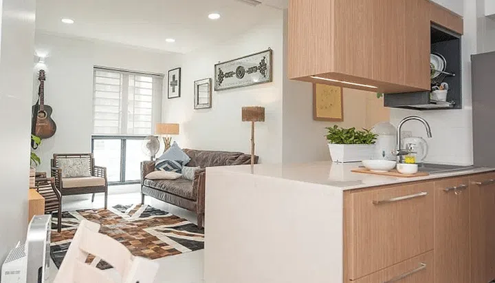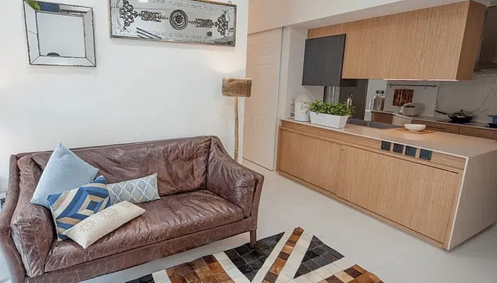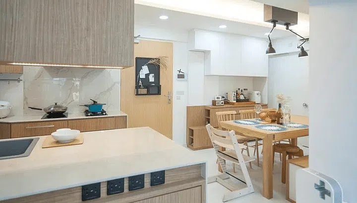 The wall between the kitchen and living room was hacked, and replaced with an island counter to extend the use of space, while maintaining visual connectivity with other parts of the home.