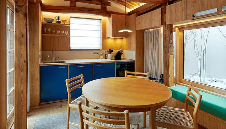 I quickly develop a soft spot for the triangular kitchen and dining area located in a separate annexe building — another design quirk of these abodes. Light-filled, airy, and well-appointed with premium Korean appliances like a Balmuda toaster and coffee making apparatus, it offers a more informal space for meals away from the main suite.