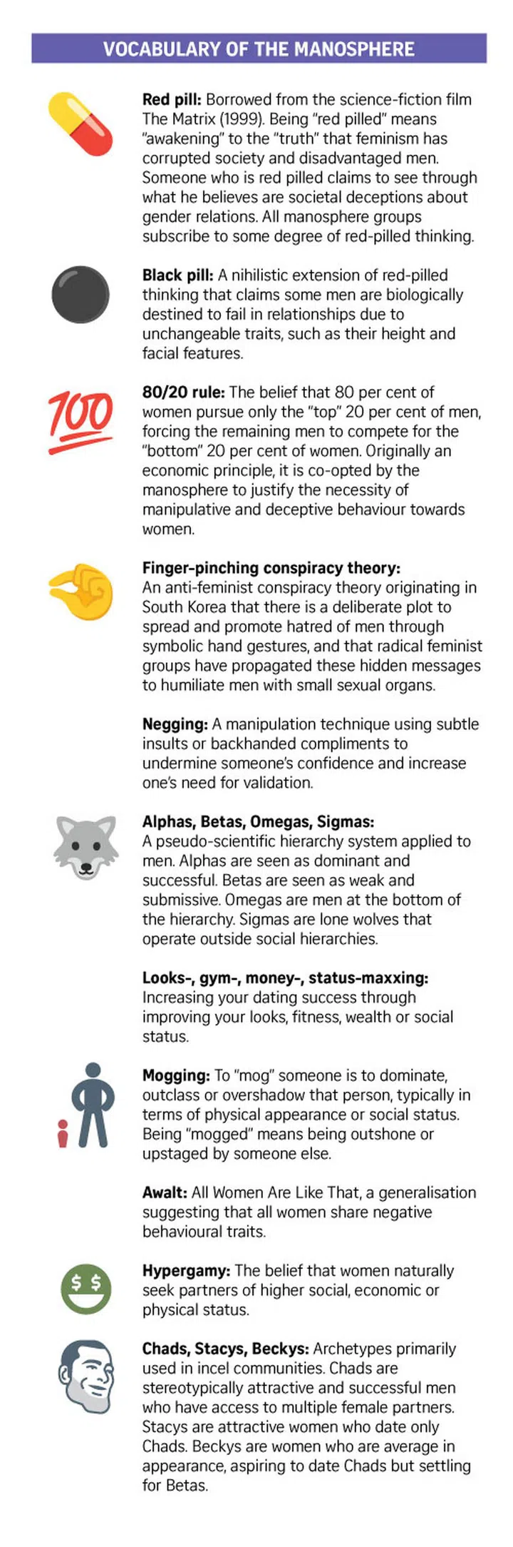 All manosphere groups describe themselves as having been “red pilled”, a term borrowed from the science-fiction film The Matrix (1999). These groups use it to mean “awakening” to the “truth” that feminism has corrupted society and disadvantaged men.