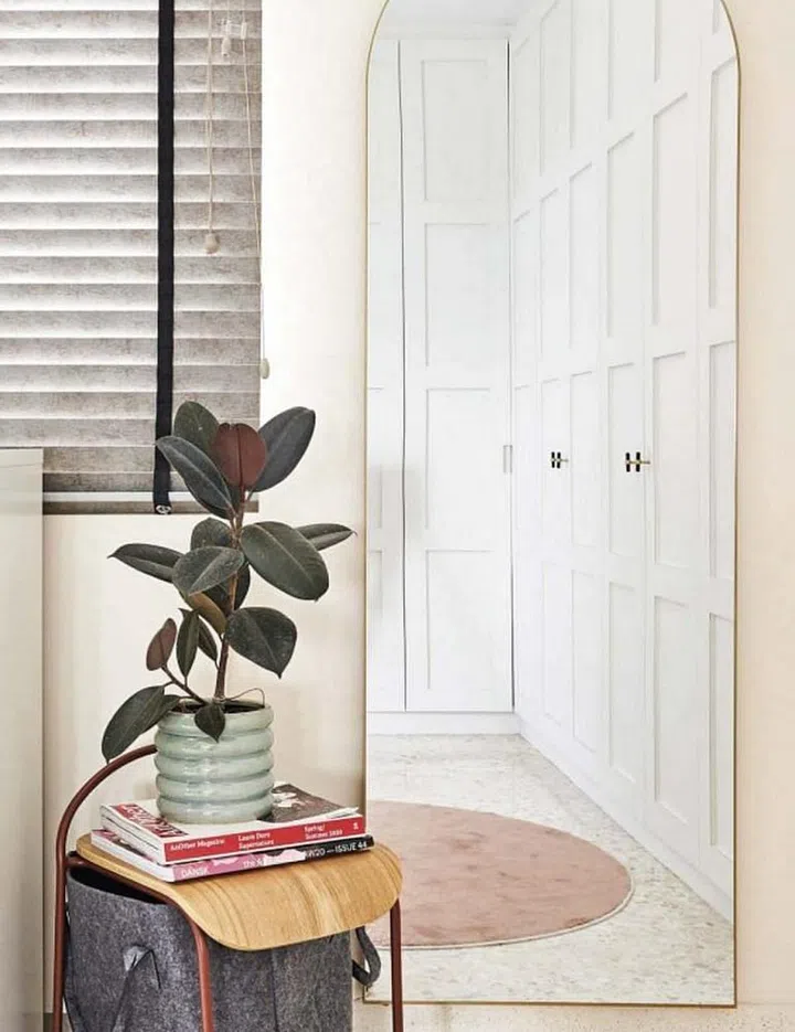The walk-in wardrobe comes trimmed with peach-toned neutrals, whereas the bedroom is awash with deep green and navy blue hues. The arched mirror visually enlarges the walk-in wardrobe area.