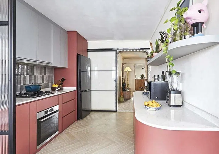 Featuring a beige, grey, and terracotta red colour scheme, the kitchen cabinets are new. “We didn’t try to match everything,” says Hong.