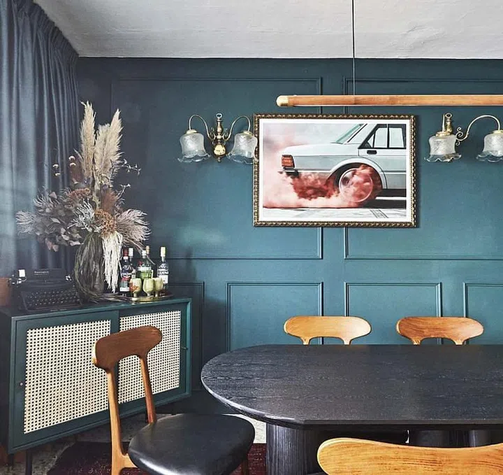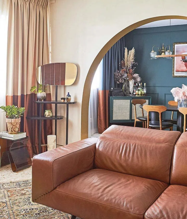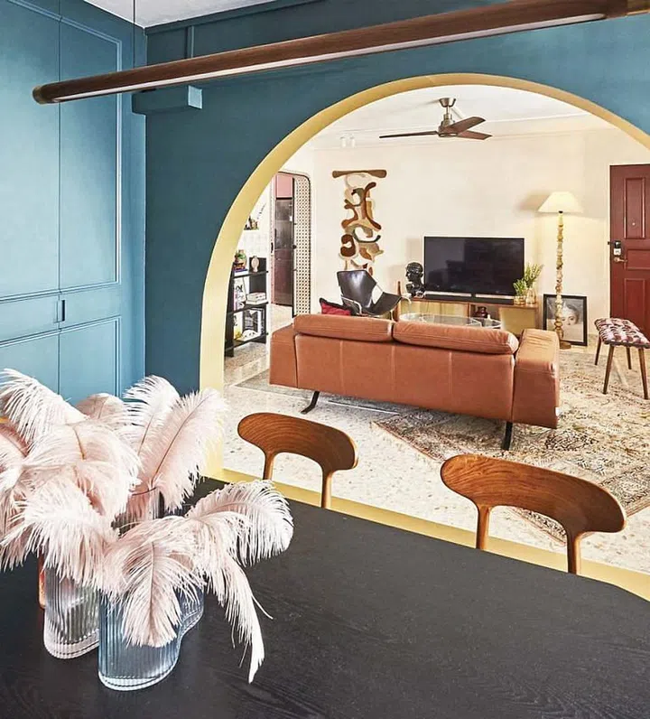 The dining area was converted from a common bedroom. With a teal wall and vintage and classic pieces juxtaposed with pop art, it connects to the living space via an oversized arch.