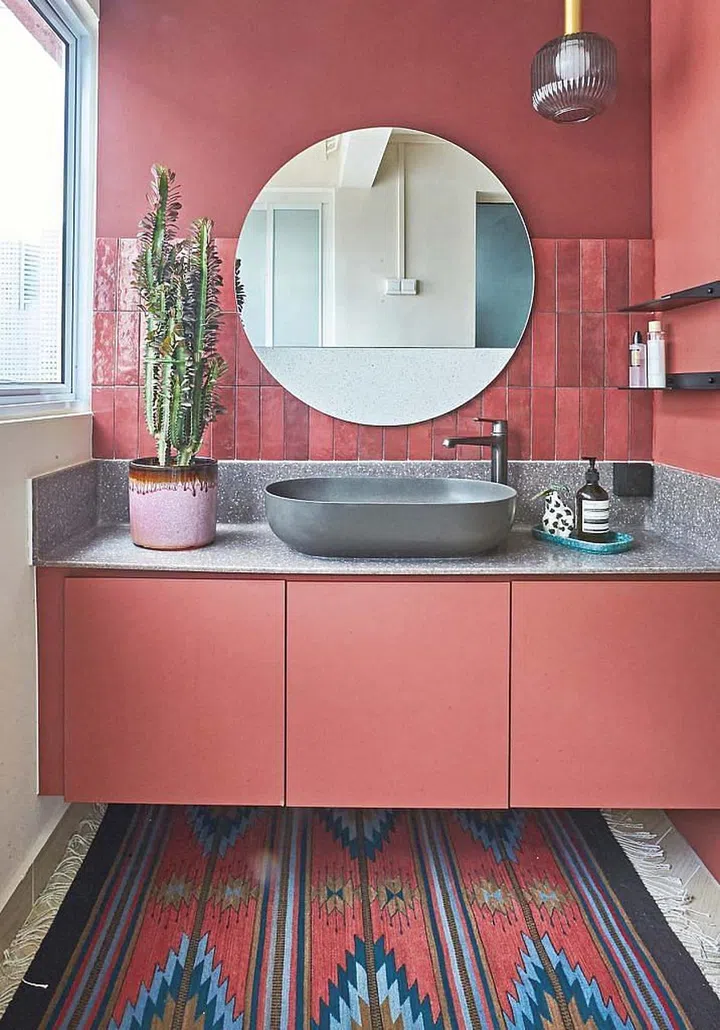 The yard features a sink area articulated with floating shelves, a round mirror and glossy subway tiles from Hafary, which also adorn the bathroom.